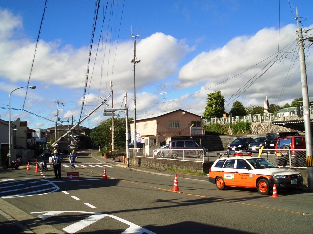 観光道路(きぬかけの路)で電柱が倒れてる。