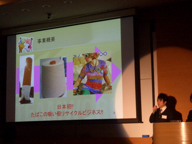 個人的に印象に残ったのは子供さんに教えるために親御さんが通う学習塾とか刑務所を出所し自立を目指す人を応援する事業、琵琶湖の浄化事業、タバコのフィルターを再生した繊維で作る超エコな洋服を作る事業、障害者の起業を支援する事業などどれも社会に必要な要素が十分ですでに企業との交渉が進んでいるもあるとのことでした。