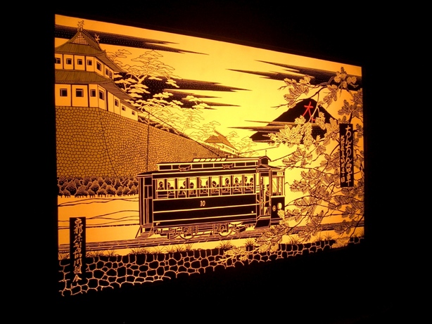 中立売橋(堀川第一橋)付近には懐かしいチンチン電車が京友禅の型紙で描かれていました。