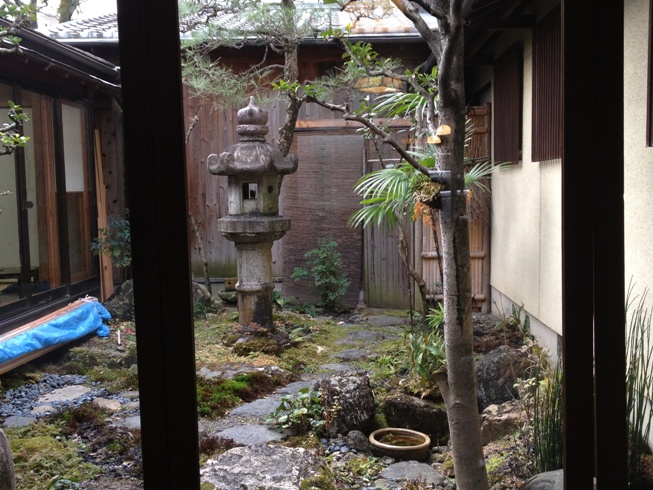 座敷からの中庭もなかなか趣がありましたが歴史を物語る建物はいろいろな向きに傾いていてお店の表もオープンですから気にならない程度の風が表通りから庭へ抜けていました。