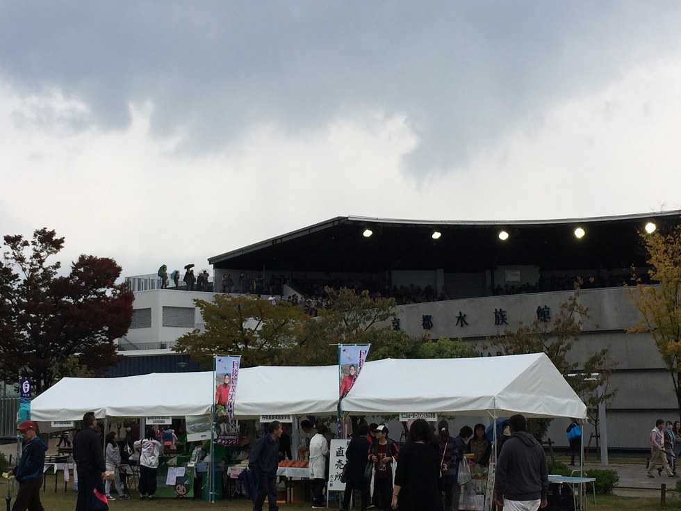 公園から見上げるとさすがに屋根付きの京都水族館は超満員。