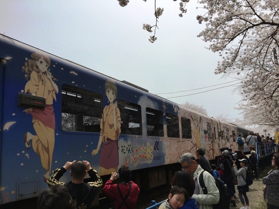 ここの景色はのどかな海を背景に桜並木の中をアニメ「花咲くいろは」や「マジンガーZ」などラッピング列車が走ることです。