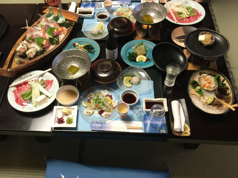 救いは氷見温泉郷「永芳閣」の「富山尽しの三大味覚」天然活アワビ+白エビ3品+氷見牛しゃぶ、舟盛刺身に氷見うどんと握り寿司と腹いっぱい満たしてもらいました。