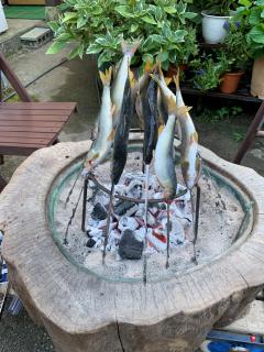 岐阜から大物の天然鮎を釣って友人宅で炭火串焼きでごちそうしてくれました。